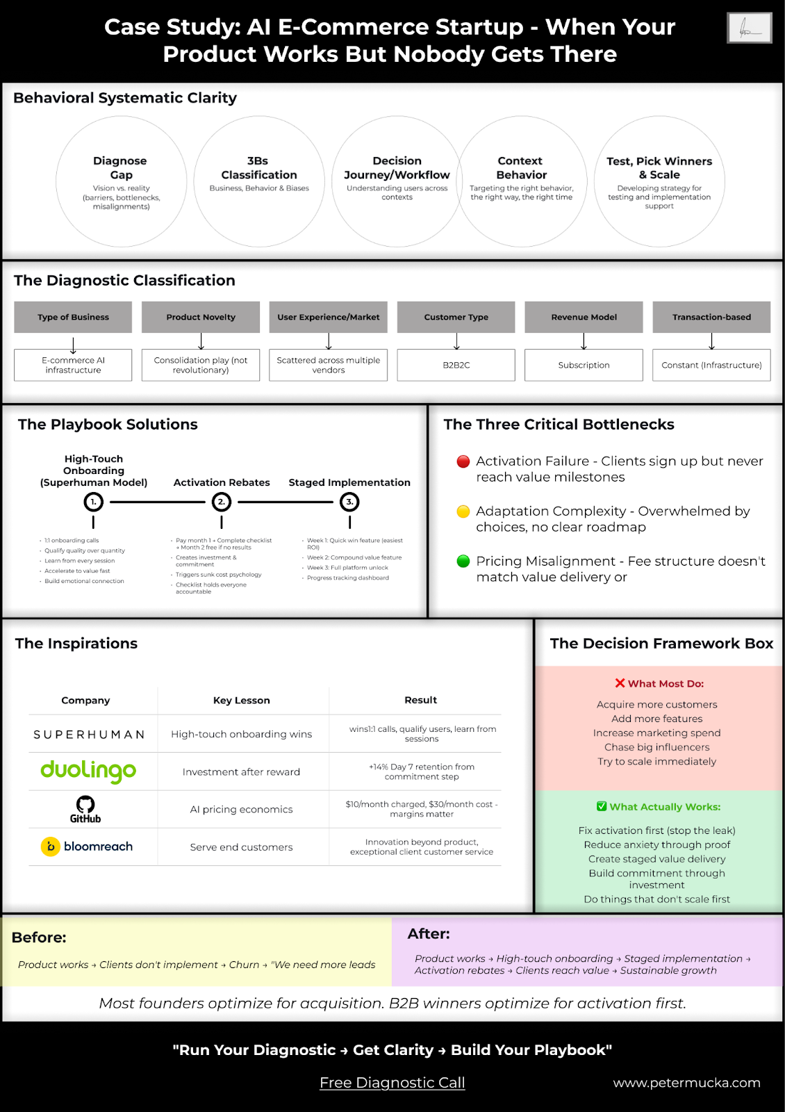 I will look at your current product, market, and the way you defined your customer and structured acquisition channels, so I can identify inconsistencies and room for improvement.